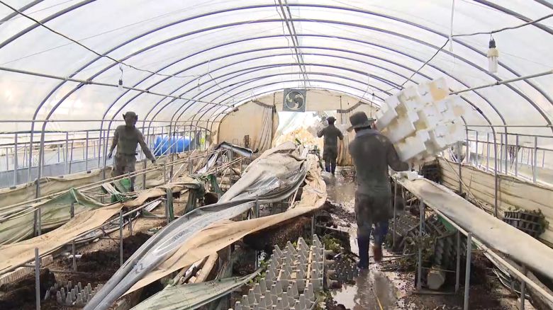 비닐하우스 내부에 빗물에 쓸려버린 딸기 모종들이 흙탕물을 뒤집어써 황토색이 되어 버렸습니다.