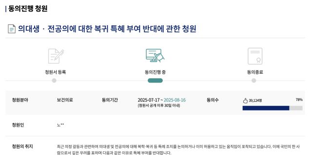 청원인은 "최근 의정 갈등과 관련해 의대생 및 전공의에 대해 복학·복귀 등 특례 조치를 논의하거나 이미 허용하고 있는 움직임이 포착되고 있다"며 "국민의 한 사람으로서 깊은 우려를 표한다"고 밝혔다.