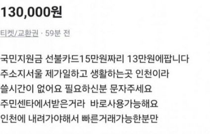 시민들의 신청이 시작된 가운데 첫날 벌써 ‘쿠폰 깡’을 하려는 매물이 당근에 올라왔다. 이날 중고거래 플랫폼 당근에는 민생회복 선불카드를 13만원에 판다는 판매 글이 등록됐다. 판매자는 “국민지원금 선불카드 15만원짜리 13만원에 판다”며 주소지와 생활 근거가 달라 쿠폰을 판다고 설명했다.