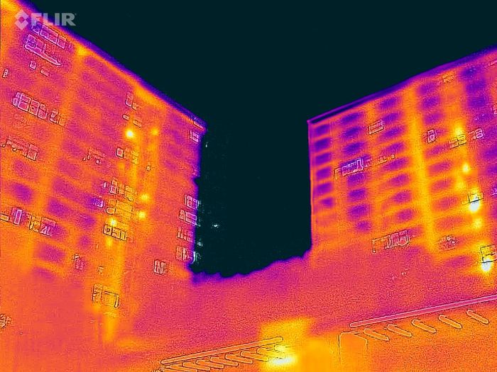 연일 폭염과 열대야가 이어지고 있는 가운데 절기상 가장 더운 대서를 하루 앞둔 21일 밤 서울 시내 한 아파트를 열화상 카메라로 촬영한 모습.  온도가 높은 곳은 붉게, 낮은 곳은 푸르게 표시돼 있다. [사진출처 = 연합뉴스]