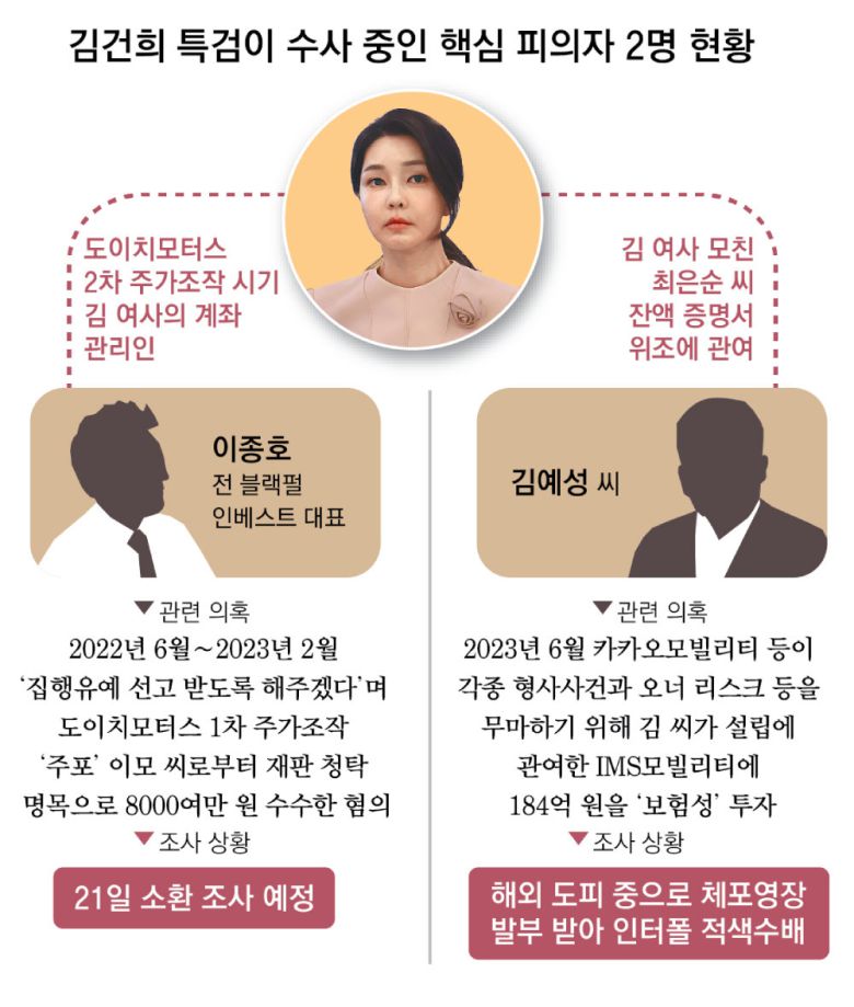 도이치모터스 주가조작 사건에서 김건희 여사 계좌를 관리했던 이종호 전 블랙펄인베스트 대표가 윤석열 전 대통령 취임 직후 주가조작 공범인 이모 씨에게 “김 여사나 VIP(대통령)에게 얘기해 집행유예가 나오게 해주겠다”며 8000여만 원을 받은 혐의로 특검의 압수수색을 받았다. 도이치모터스 사건의 핵심이었던 이 전 대표와 이 씨는 구속 기소된 후 보석으로 풀려난 상태였다. 형사 피고인 신분이던 이 전 대표가 “김 여사가 계속 챙겨보고 있다”면서 재판 청탁 대가로 거액을 받았다는 것이다.