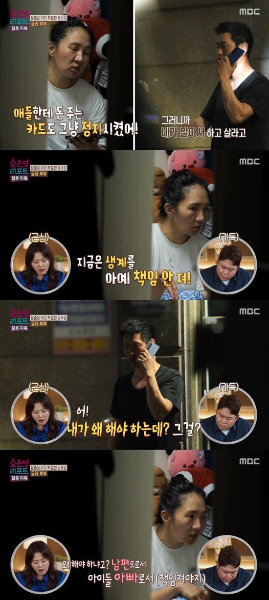 아내는 남편과 통화 중에 "너 굶어 죽든지 말든지 애들도 마찬가지래. (남편이) 애들한테 돈을 주는 카드도 정지시켰다. 지금은 생계를 아예 책임을 안 진다"라고 말했다. 이에 남편은 "내가 왜 해야 하냐. 하기 싫다. 툭하면 (나를) 경찰에 신고했고 벌금을 물었다"라고 답했다. 아내는 "예전에 오빠가 때렸다"라고 말했다.
