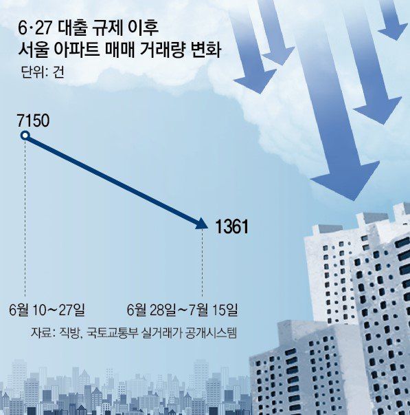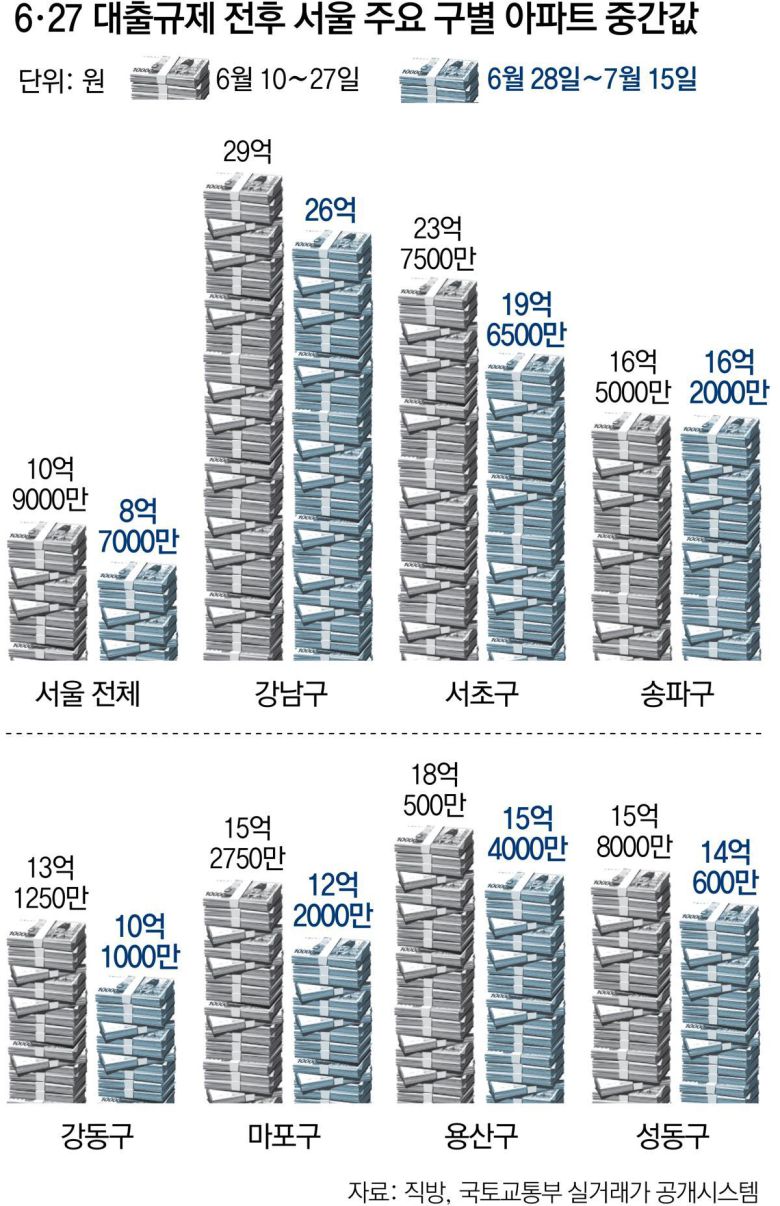 주택담보대출 상한선을 6억 원으로 제한한 6·27 대출 규제 이후 서울 강남권 등 고가 아파트를 중심으로 매매가격 중간값이 하락한 것으로 나타났다. 서울 아파트 거래량이 80% 이상 급감하는 등 거래가 위축되면서 시세보다 싸게 거래하는 급매 위주로 팔린 데다, 자금 마련 부담이 커져 상대적으로 저렴한 중소형 아파트 거래가 늘어났기 때문으로 분석된다.