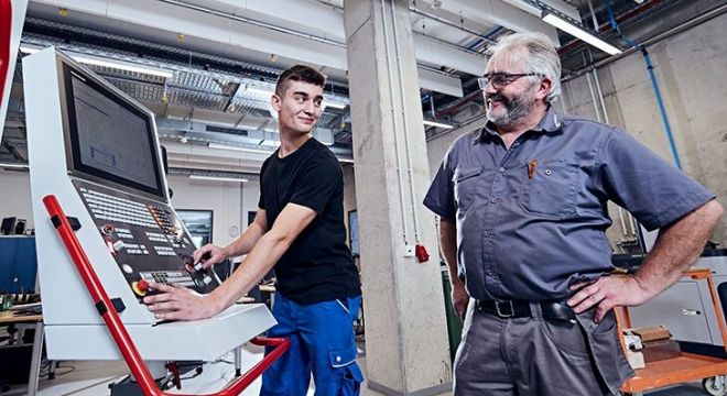 독일의 이원화된 직업교육은 기업과 학교의 유기적 협업으로 이루어진다. 고정밀 기계 기술을 배우는 도제생과 마이스터(장인)인 강사가 정밀공작기계인 CNC 밀링 패널 앞에서 현장 교육을 진행하고 있다. BIBB 제공 |