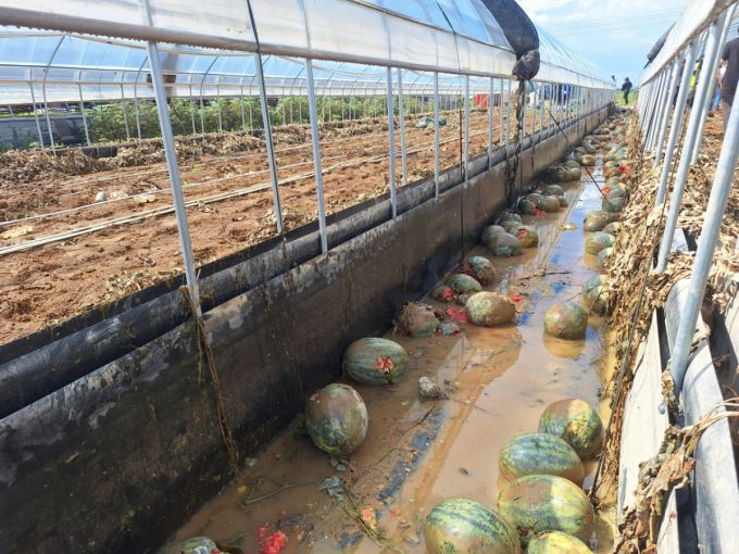 21일 오전 충남 예산군의 한 비닐하우스에 수박 등 농작물들이 터져서 고랑에 버려진 모습. /사진=김지은 기자 |