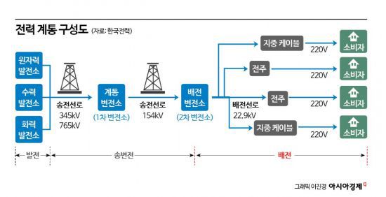전력 계통은 송·변전과 배전으로 나뉜다. 발전소에서 변전소까지 고압 전기를 보내는 구간이 송·변전망이고, 변전소에서 전주나 지중(지하) 선로를 거쳐 가정과 건물에 전기를 공급하는 구간이 배전망이다. 보통 변전소에서는 22.9킬로볼트(㎸) 전압으로 전기를 공급하고, 전주에서는 이를 220V로 낮춰 소비자에게 전달한다.