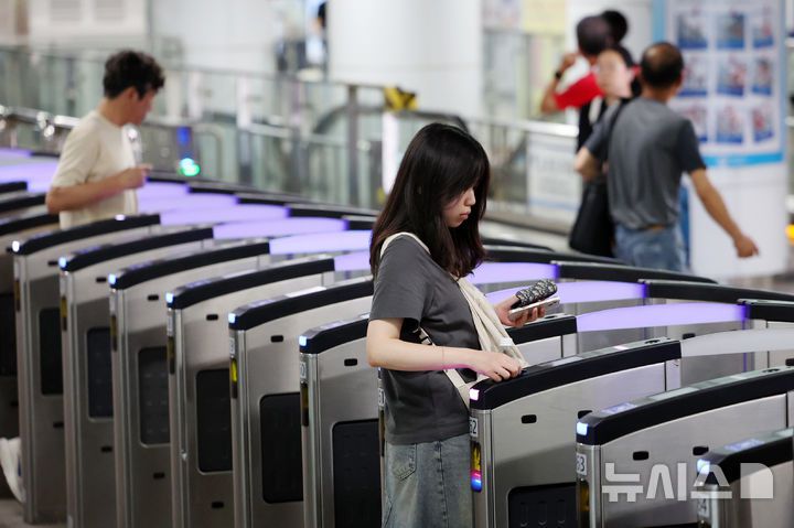 [서울=뉴시스] 조성우 기자 = 한 시민이 29일 서울 시내의 한 지하철역 개찰구에서 교통카드를 태그하고 있다. 지난 28일부터 서울·인천·경기 지하철을 탈 때 교통카드 기본요금이 기존 1400원에서 1550원으로 150원 인상됐다. 2025.06.29. xconfind@newsis.com |