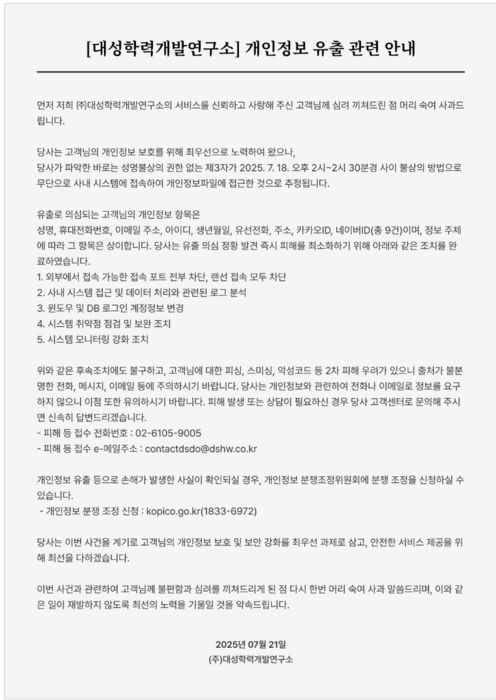 대성학력개발연구소는 21일 홈페이지를 통해 '개인정보 유출 관련 안내'를 공지했다. 연구소 측 설명에 따르면 18일 오후 2시~2시 30분경 제3자가 사내 시스템에 접속해 개인정보 파일에 접근한 것으로 파악됐다.