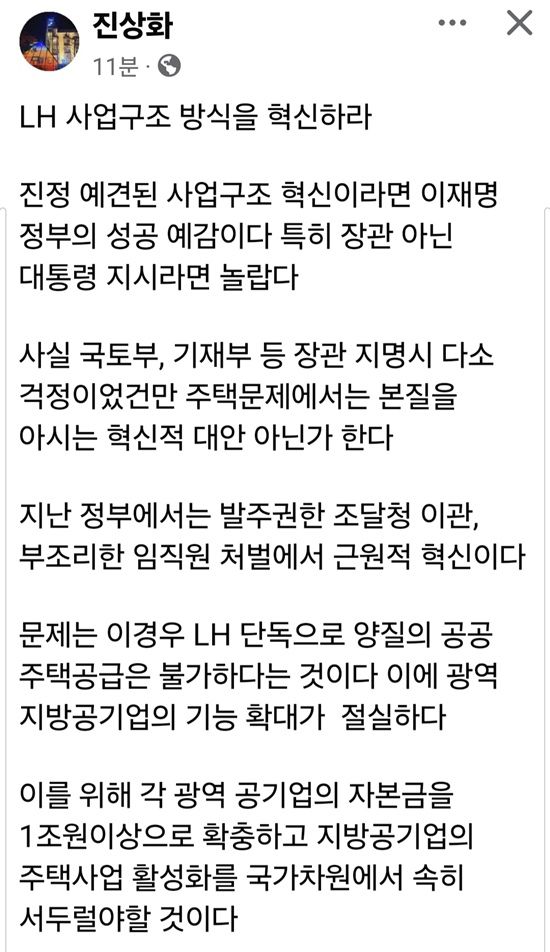 진 사장은 지난 21일부터 오는 23일까지 3일간 하계휴가원을 제출했는데 21일 늦은 저녁 자신의 페이스북에 쌩뚱 맞게 'LH 사업구조 방식을 혁신하라'는 글을 올렸다.