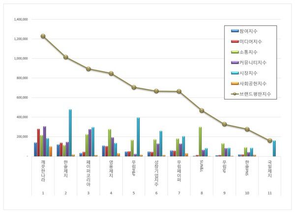 5위, 무림P&P 브랜드는 참여지수 49,314 미디어지수 52,106 소통지수 167,891 커뮤니티지수 25,158 시장지수 396,348 사회공헌지수 15,704가 되면서 브랜드평판지수 706,522로 분석됐다. 지난 6월 브랜드평판지수 815,983과 비교해보면 13.41% 하락했다.