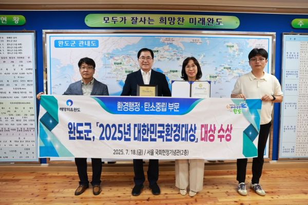 완도군이 지난 18일 서울 국회 헌정기념관에서 열린 제20회 2025 대한민국 환경 대상 시상식에서 환경 행정 탄소중립 분야의 대상의 영예를 안았습니다.사진 왼쪽에서 두번째 신우철 완도군수가 직원들과 환하게 웃으며 포퍼먼스를 취하고 있습니다.사진제공 완도군