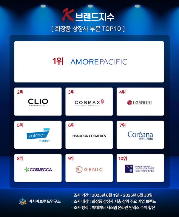 한정근 아시아브랜드연구소 대표는 "글로벌 경기 둔화와 중국 소비 시장의 불확실성에도 불구하고, 국내 화장품 업계는 기술 기반의 스킨 케어, 클린 뷰티, 저자극 제품 등을 앞세워 브랜드 경쟁력 강화에 주력하고 있다. 아모레퍼시픽이 1위에 등극한 것은 온라인을 기반으로 소비자와의 꾸준한 접점 강화 노력이 반영된 결과"라고 밝혔다.