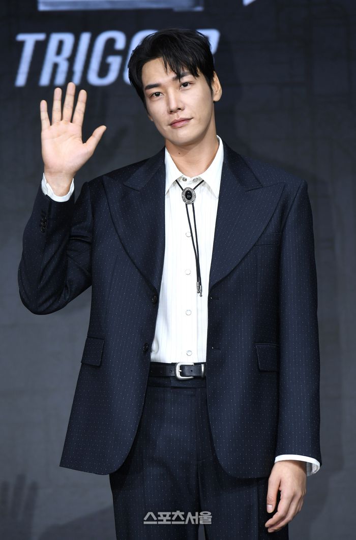배우 김영광이 22일 서울 마포구 호텔나루 서울 엠갤러리에서 열린 넷플릭스 시리즈 ‘트리거’ 제작발표회에서 취재진을 향해 포즈를 취하고 있다.