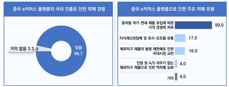 피해 유형으로는 '중국발 저가·면세 제품 유입에 따른 가격 경쟁력 저하가' 59%로 가장 많은 가운데 ▲지식재산권 침해(17%) ▲해외직구 제품의 불법 재판매(16%) ▲인증 및 A/S 의무가 없는 해외직구 제품으로 인한 역차별 심화(4%) 등이 뒤를 이었다.