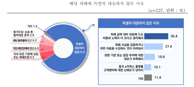 특별히 대응하지 않는 이유로는 ▲피해 금액 대비 대응에 드는 비용과 노력이 더 크다고 생각해서(35.4%) ▲피해 사실을 입증하거나 관련 자료를 수집하는 것이 어려워서(27.4%) ▲관련 기관 또는 담당 부처에 대한 정보가 부족해서(15.6%) 등이 주를 이뤘다.