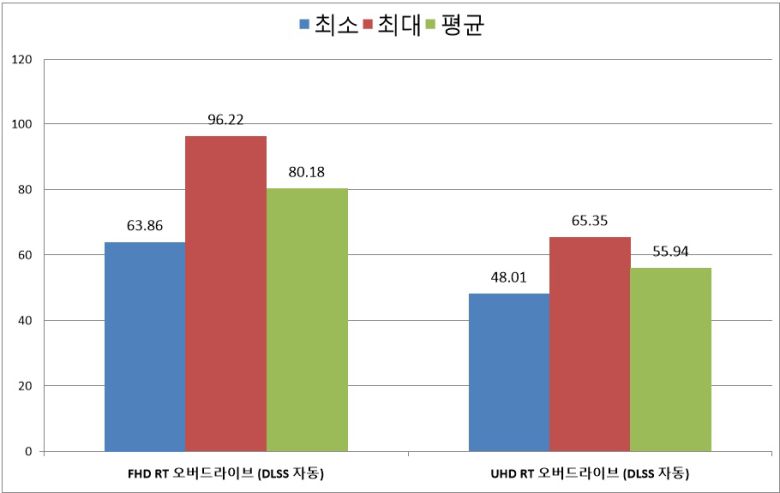 '사이버펑크 2077'은 레이트레이싱 오버드라이브 옵션에 DLSS 자동으로 인 게임 벤치마크를 진행했다. FHD 해상도의 경우 최소 63.86FPS 최대 96.22FPS 평균 80.18FPS를 기록했다. 4K UHD 해상도에서는 최소 48.01FPS 최대 65.35FPS 평균 55.94FPS를 기록했다.