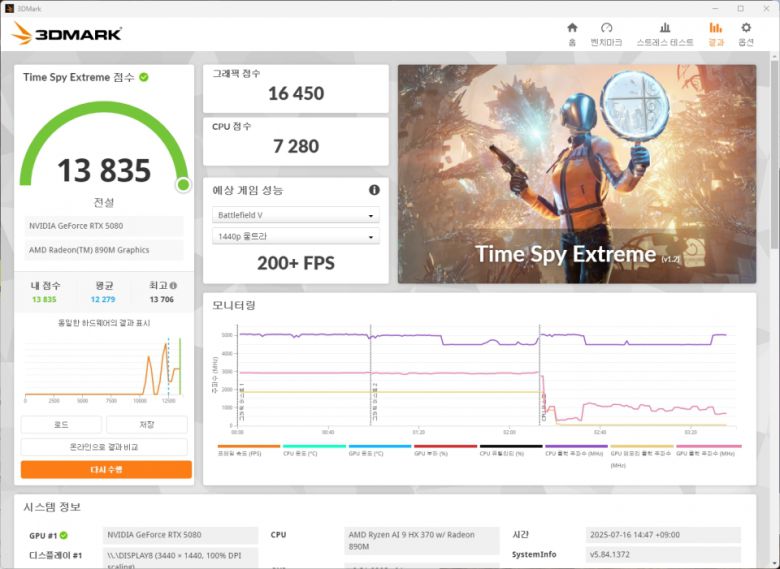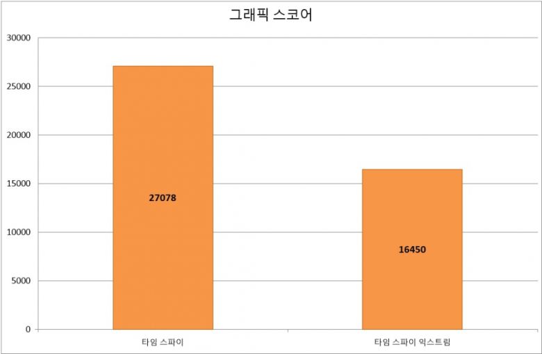 3D마크 타임 스파이 벤치마크 결과이다. 타임 스파이의 그래픽 스코어는 27,078점, 타임 스파이 익스트림의 그래픽 스코어는 16,450점으로 측정되었다.