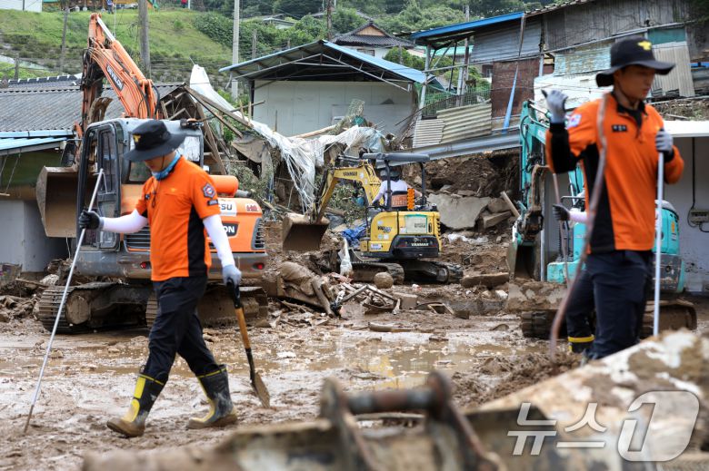22일 폭우와 산사태 피해를 입은 경남 산청군 신등면 율현마을에서 실종자 수색작업이 이뤄지고 있다. 2025.7.22/뉴스1 ⓒ News1 윤일지 기자 |