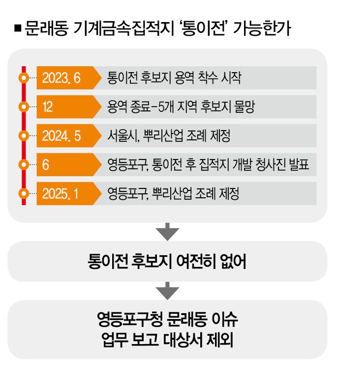 그런데도 영등포구청 역시 적극적으로 나서지 않고 있다. '구청 업무 보고'에서 문래동 이전 이야기가 사라졌을 정도다. 2024년 영등포구의회 A의원이 "왜 문래동 이전 관련 보고를 하지 않느냐"고 묻자 구청 관계자는 이렇게 답했다.
