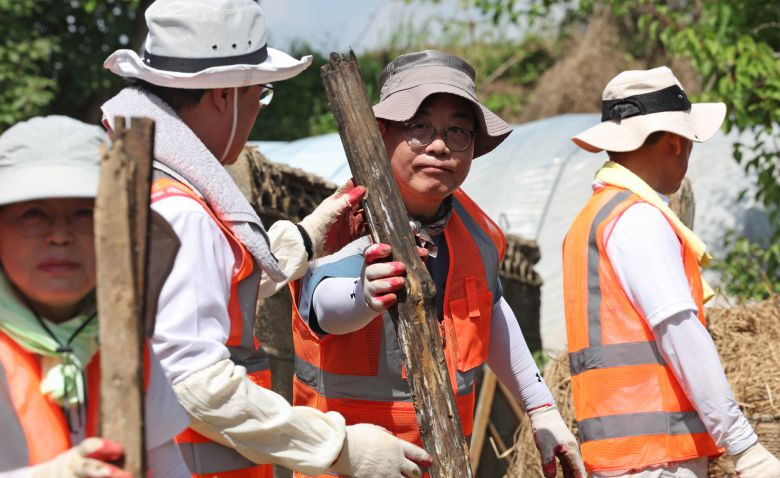 송언석 국민의힘 비대위원장 겸 원내대표(오른쪽 두번째)를 비롯한 당 관계자들이 22일 충남 예산군 삽교읍 수해 현장을 찾아 복구 작업을 하고 있다. [연합] |