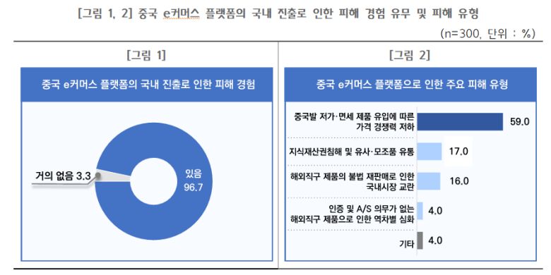피해 유형별로는 ‘중국발 저가·면세 제품 유입에 따른 가격 경쟁력 저하’가 59.0%로 가장 많았다. 이어 ‘지식재산권 침해’(17.0%), ‘해외직구 제품의 불법 재판매’(16.0%), ‘인증 및 A/S 의무가 없는 해외직구 제품으로 인한 역차별 심화’(4.0%) 등의 순이었다.