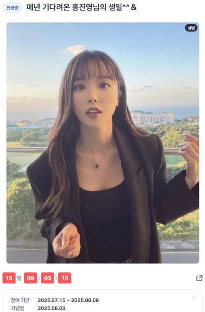 디시트렌드에서는 홍진영의 생일을 기념하는 이벤트가 진행 중이다. "매년 기다려온 홍진영님의 생일^^&"라는 문구 아래, 지난 15일부터 오는 8월 6일까지 응원이 이어지고 있다. 기념일은 홍진영의 생일인 8월 9일이다.