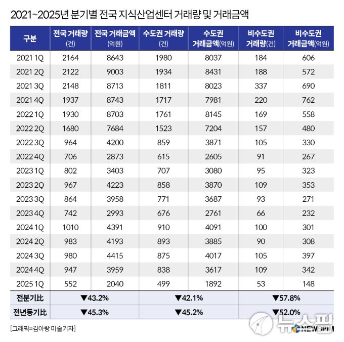 2021~2025년 전국 지식산업센터 거래량 및 거래금액 변동 추이. [그래픽=김아랑 미술기자]