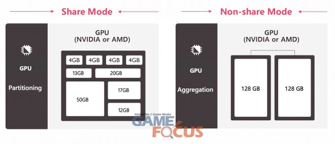 또한 업계 최초인 고객 요구에 맞추어 GPU 리소스를 분할하여 사용할 수 있는 쉐어 모드와 고성능 HPC 환경 구성을 제공한다. CPU와 메모리, 스토리지를 분할하는 VM과 같이 GPU 리소스를 분할 수 있으며, 이를 통해 보다 최적화된 분할 구성으로 유기적인 자원 효율성 및 비용 절감, 서버 통합 운영을 통해 하드웨어 자원의 활용도를 극대화 할 수 있다.