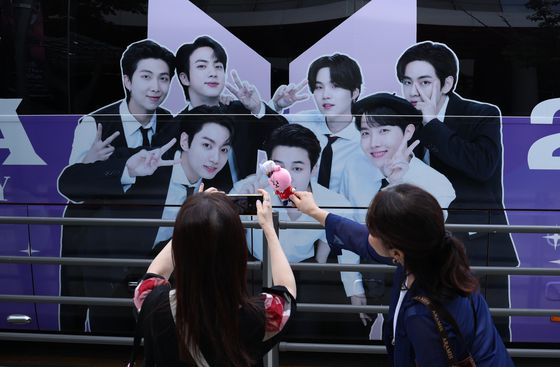 지난달 9일 오전 서울 용산구 하이브 사옥 앞에서 방탄소년단(BTS) 글로벌 팬들(아미)이 기념 촬영을 하고 있다. 뉴스1 |