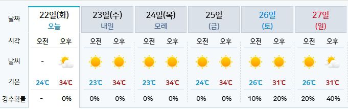기상청에 따르면 22일부터 25일 금요일까지 낮 최고기온은 연일 34도까지 오를 것으로 예보됐다.