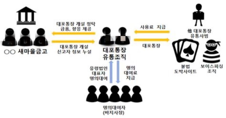D씨 등은 대포통장을 직접 도박사이트 등에 유통하고 사용료를 받았다. 또한 다른 대포통장 유통업자들에게 유령 계좌를 개설할 수 있도록 해당 새마을금고를 소개시켜준 뒤 수수료를 받기도 했다. 이를 통해 약 30억원의 범죄수익을 올렸다.