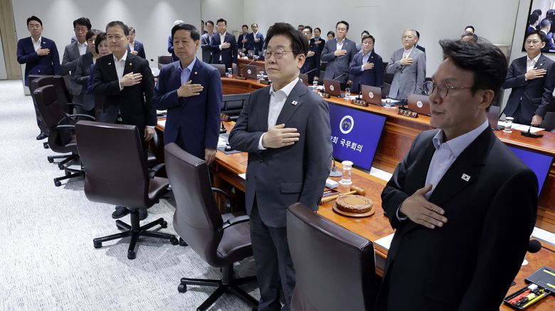 ▲ 이재명 대통령이 22일 서울 용산 대통령실 청사에서 열린 국무회의에서 국기에 경례를 하고 있다.