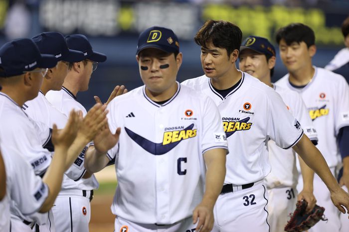 두산 양의지와 김재환이 서울 잠실구장에서 열린 2025 KBO리그 정규시즌 KT전 승리 후 선수단과 하이파이브를 하고 있다. 사진 | 두산 베어스 |