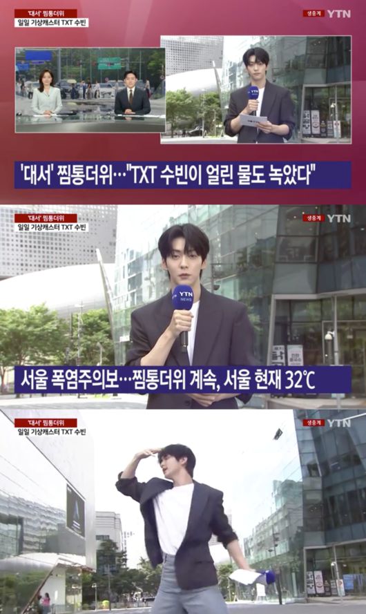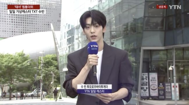 이날 수빈은 이혜민 기상캐스터와 함께 서울 마포구 상암동에 나와 직접 현장 날씨 중계를 시도했다. 수빈은 “폭우와 폭염으로 힘겨운 여름을 보내고 계시는 분들께 위로와 응원을 전해드리고자 상암동을 찾은 YTN 일일 기상캐스터, 투모로우바이투게더 수빈이다”라고 인사했다.