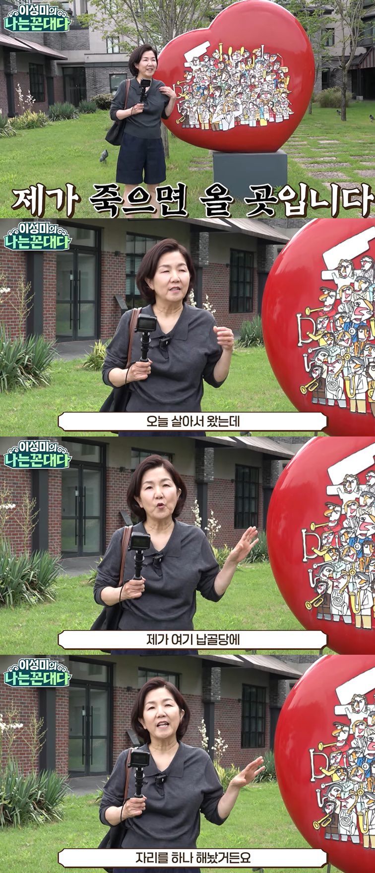 이날 이성미는 봉안당을 찾아 직접 공간을 소개했다. 그는 "여기가 바로 제가 죽으면 올 곳이다. 오늘 살아서 왔는데 제가 여기 납골당에 자리를 하나 해놨다"며 "내 죽음에 대해서 내가 먼저 준비해 놓으면 아이들이 편하겠다고 생각해서 이것저것 준비했다"고 설명했다.