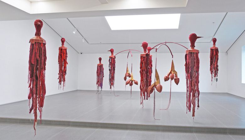 서울 성북동 우손갤러리 2층 전시실. 거대한 붉은 새 형상의 모빌 여덟 점이 공기 중의 미세한 숨결에도 느리게 몸을 흔든다.