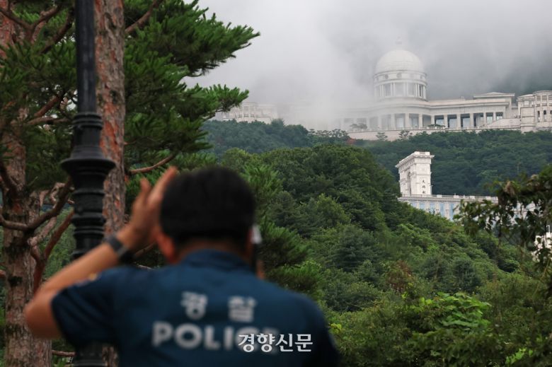 김건희 특검팀이 건진법사 청탁 의혹과 관련해 경기 가평군 통일교 본부를 압수수색한 지난 18일, 경찰 관계자가 통일교 본부 입구에 서 있다 정효진 기자 |
