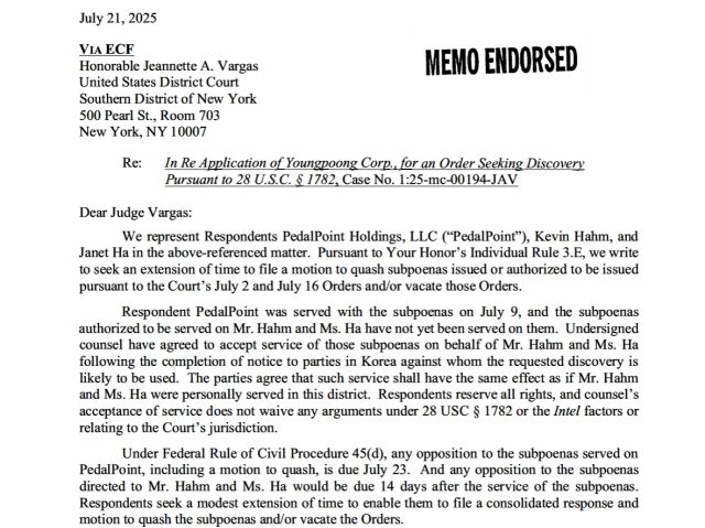 21일(현지시간) 미국 뉴욕주(州) 남부 지방법원은 페달포인트와 관련된 인물들이 제기한 절차상 이의 제기 준비 시간을 보장하기 위해, 관련 소환장(Subpoena)에 대한 이의 제기 및 법원 명령 무효화 신청의 제출 기한을 8월 7일로 연장하는 것을 승인했다. 이에 따라 영풍과 MBK 측이 기대했던 조속한 증언 확보가 다소 지연될 가능성이 커졌다.