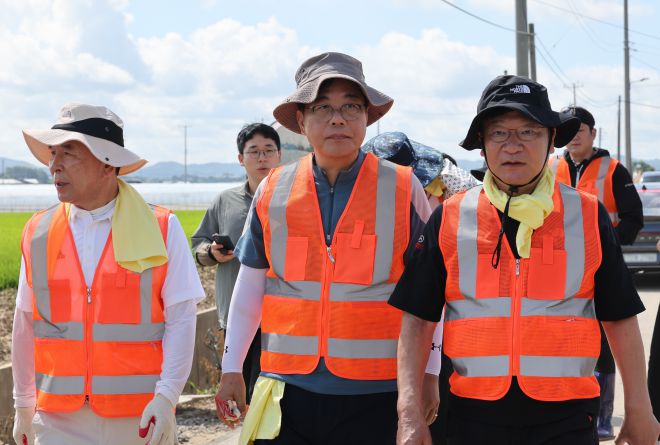 김문수 전 고용노동부 장관은 충남 예산에서 수해 복구 봉사를 했다. 현장에서 송 원내대표 등 국민의힘 의원들과 만나 악수를 나눴다. 김 전 장관은 지난 20일 당대표 출마 선언 이후 현안에 대한 메시지를 줄이고 수해 복구 현장에 집중하는 모습이다.
