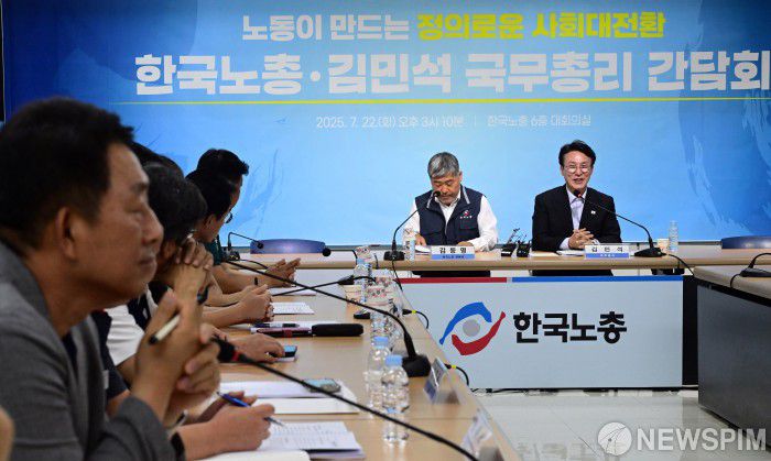 [서울=뉴스핌] 청사사진기자단 =김민석 국무총리가 22일 오후 서울 영등포 한국노총에서 열린 간담회에 참석해 모두발언을 하고 있다. 2025.07.22 photo@newspim.com |