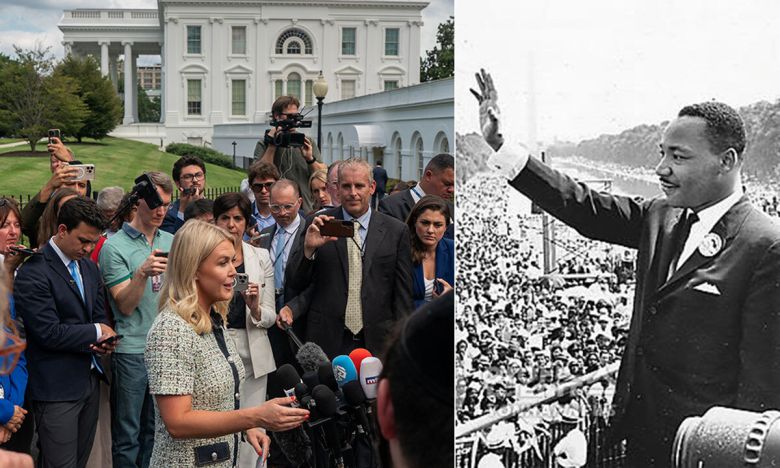 새 사실 밝혀질까 캐럴라인 레빗 백악관 대변인(가운데)이 21일(현지시간) 미국 워싱턴 백악관 서쪽 별관 인근에서 최근 현안과 관련한 취재진의 질문에 답하고 있다.(왼쪽사진) 오른쪽 사진은 이날 도널드 트럼프 행정부가 연방수사국(FBI)의 감시 기록을 공개한 흑인 인권운동가 마틴 루서 킹 주니어 목사의 생전 모습. 워싱턴=로이터연합뉴스·세계일보 자료사진