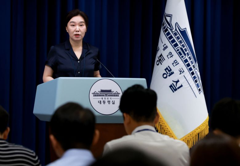 강유정 대통령실 대변인이 22일 서울 용산 대통령실 청사에서 인사 관련 브리핑 뒤 취재진의 질문에 답하고 있다. 연합뉴스