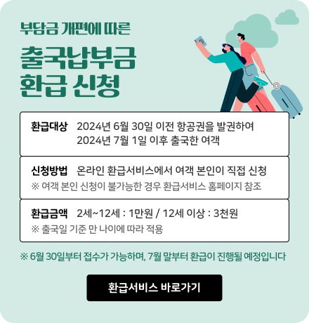 이에 따라 2024년 6월 30일 이전에 항공권을 발권하고 7월 1일 이후 국내 공항을 통해 출국한 여객은 나이에 따라 환급을 받을 수 있다. 만 2세 이상 12세 미만은 1만 원, 12세 이상은 3천 원을 환급받는다. 단, 기존 면제대상이었던 만2세 미만은 환급대상에서 제외된다.