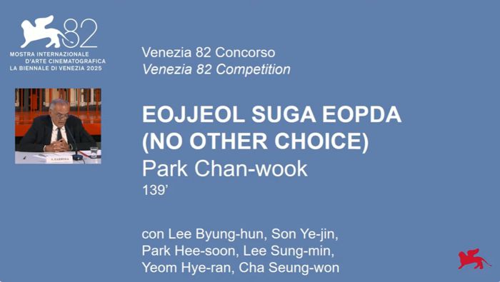 박찬욱 신작 ‘어쩔수가없다’가 베네치아영화제 경쟁 부문에 진출했다. 화면은 베네치아영화제 유튜브 기자회견에서 ‘어쩔수가없다’가 호명되는 모습. [베네치아영화제 유튜브 캡처] |