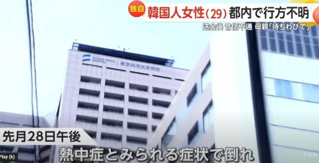 일본 후지뉴스네트워크(FNN)는 앞서 지난달 27일 여행차 일본을 찾은 한국인 A씨의 행방이 이튿날부터 묘연하다고 지난 21일 보도했다. A씨는 지난달 28일 열사병으로 추정되는 증상으로 쓰러져 도쿄 현지 병원에 이송돼 치료받았다. A씨는 이 과정에서 가족과 연락해 치료비를 송금받았고, 치료비를 정산한 뒤 퇴원했다. 도쿄 관할 경찰인 경시청도 A씨가 병원에서 혼자 나가는 모습을 확인했다.