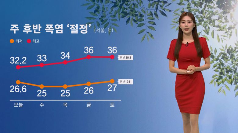 주 후반으로 갈수록 더위의 힘은 더 강해지겠습니다. 특히, 금요일과 토요일에는 서울의 낮 기온이 36도까지 오르며 폭염의 절정을 보이겠습니다.