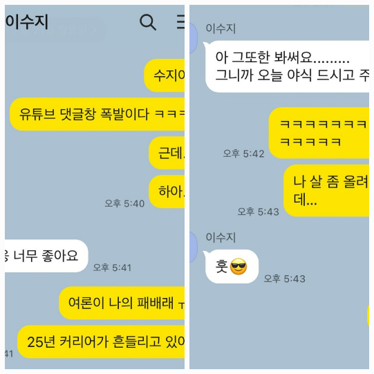 하지만 회식 후 약 3시간 뒤 싸이는 또 다른 폭탄 선언을 남겼다. 이수지와의 카카오톡 대화 내용을 공개하며 “러브버그쑈 리매치 확정. 광주 막공”이라며 도발을 시작했다.