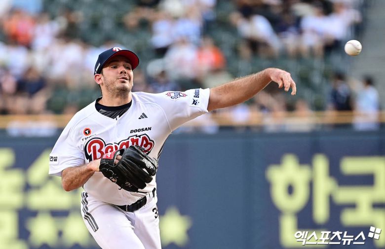 잭로그는 7회초 1사 후 최재훈에게 좌전 안타를 내줬다. 대신 심우준의 병살타로 미소 지었다.