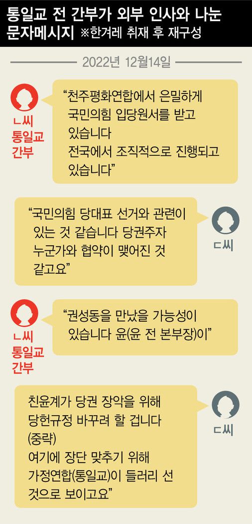 한겨레가 확보한 통일교 간부 등의 문자메시지 내용에서도 통일교 차원의 조직적인 국민의힘 입당 시도가 확인된다. 2022년 12월14일 밤 9시께 한 통일교 간부 ㄴ씨가 교단 외부 인사 ㄷ씨에게 “UPF(천주평화연합)에서 은밀하게 국민의힘 입당 원서를 받고 있습니다. 전국에서 조직적으로 진행되고 있습니다”라고 하자, ㄷ씨는 “내년 3월 국민의힘 당대표 선거와 관련이 있는 것 같습니다. 당권주자 누군가와 협약이 맺어진 것 같고요”라고 답했다. 이에 간부 ㄴ씨는 “권성동을 만났을 가능성이 있습니다. 윤(윤아무개 전 세계본부장)이”라고 덧붙였다.