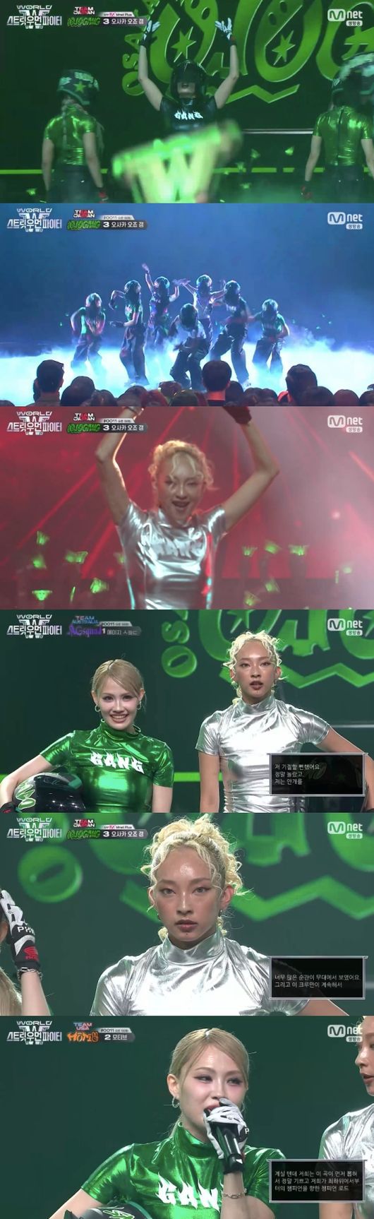 오사카 오죠 갱은 '챔피언'으로 무대를 공개했다. 헬멧을 쓰고 등장한 이들. 이들은 ‘월드 오브 스우파’ 중 인상적이었던 장면으로 메가 크루 미션을 꼽고, 그대로 재현해냈다. 쿄카의 분노의 펀치 장면, 탈락 배틀 등 다양한 장면을 녹여낸 안무에 팬들도 뜨거운 박수를 보냈다.